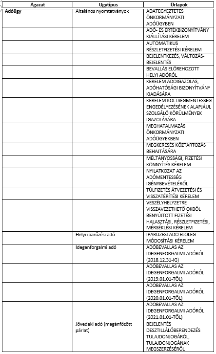 Ezen oldalon az „Ágazat”, majd az „Ügytípus” kiválasztása után az „Űrlap keresése” gombra kattintva a rendszer megkeresi a használni kívánt dokumentumot, ami az „Online kitöltés”-re klikkelve válik kitölthetővé.