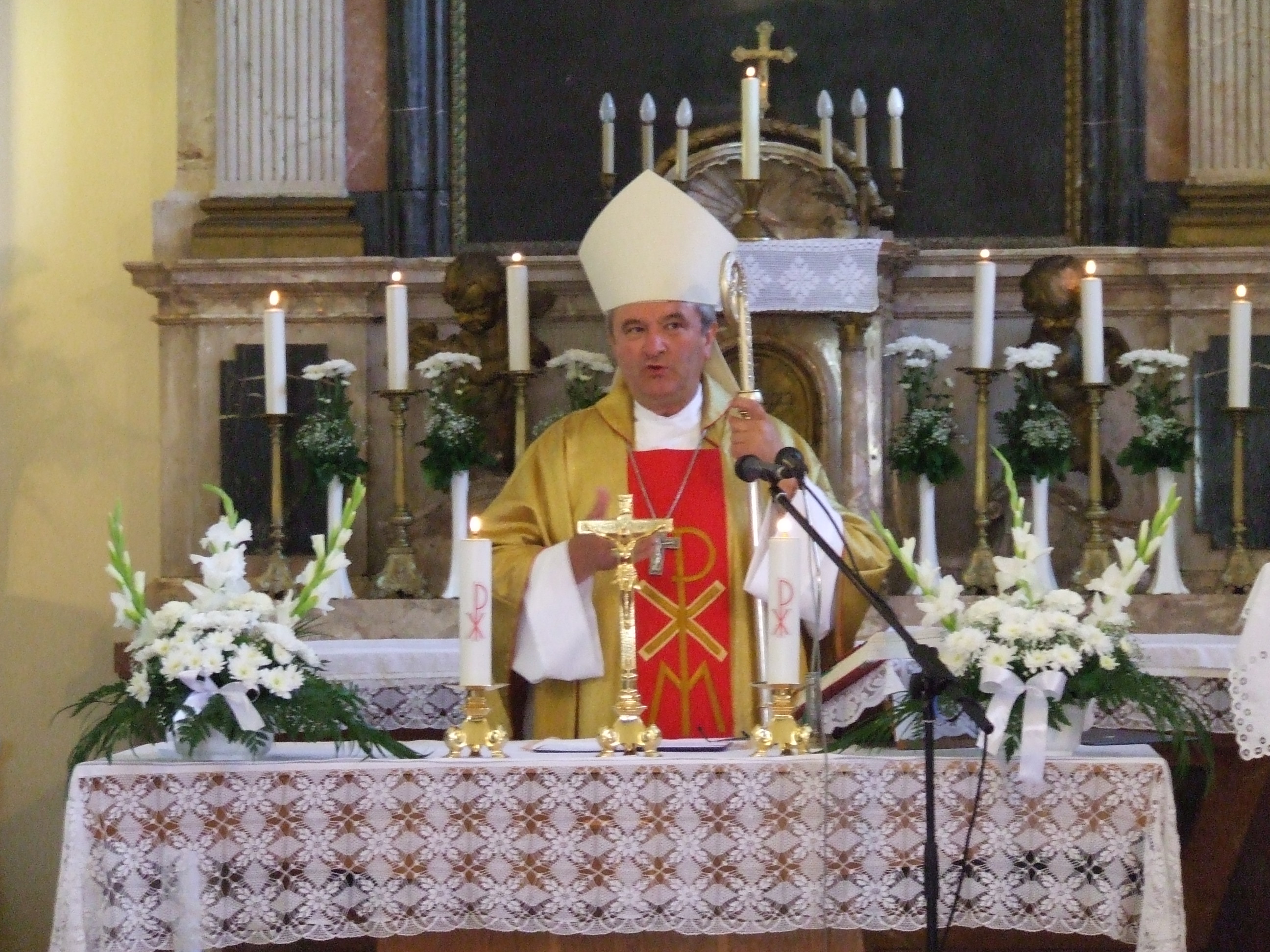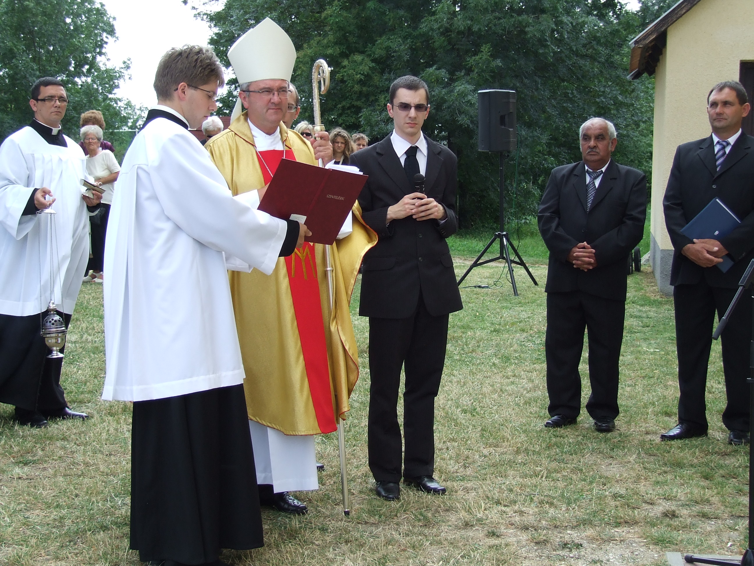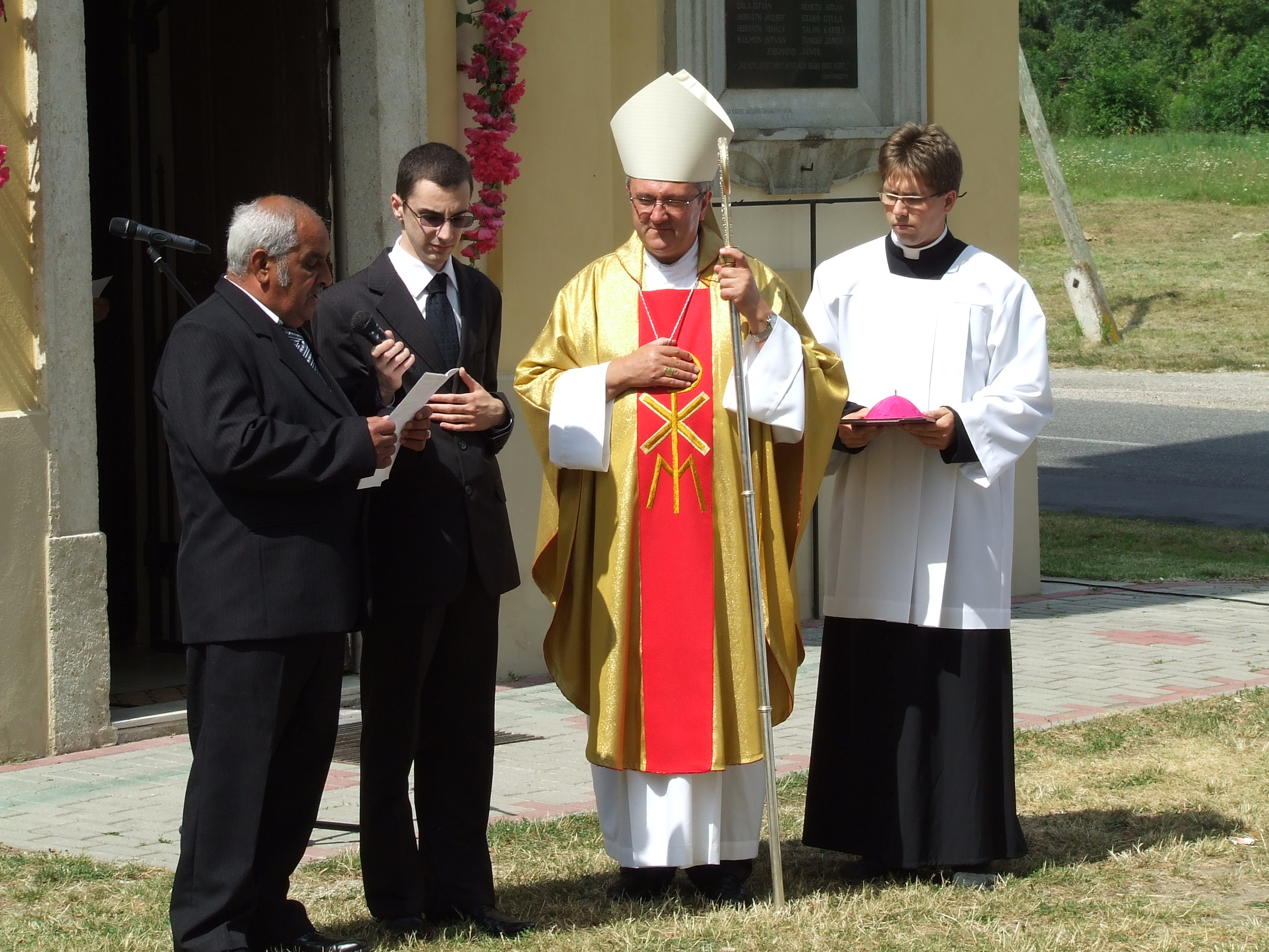 A július 14-én bemutatott szentmise a templom előtt vette kezdetét, ahol Erdélyi Antal részönkormányzat-vezető mondott köszönetet mindazoknak, akiknek a jóvoltából megszépülhetett a templom. Horváth Ferenc, világi elnök köszöntőjét követően Nagy Cintia, Horváth Rebeka és Zsoldos Kitti egy Reményik Sándor verssel fogadta a szombathelyi püspököt. A templomba lépés előtt Dr. Veres András megáldotta a megszépült épületet, majd a Krisztus szenvedésére emlékeztető, Izsákfa valamint a Bokod utca végén álló úti keresztet, mely a téli időjárás viszontagságai miatt szorult felújításra. Áldást mondott a több mint 30 éves haranglábra is, mely Németh Gyula és Gregorich Ferenc népművészek keze munkáját dicséri, és amelyet a Városgondnokság állított helyre a közelmúltban. A felújított templomban tartott ünnepi szentmisén a püspök prédikációjában a szeretet hierarchiájáról tanított, majd utalt a szent helyek jelentőségére is: „Habár Isten nem köthető egyetlen fizikai helyhez sem, az Istenben hívő embereknek mégis szükségük van arra, hogy legyen egy hely, ahol közösen imádkozhatnak.” – mondta dr. Veres András, aki reményét fejezte ki, hogy az izsákfai templom megújulásával az emberek egyéni és családi vallásossága is megerősödik. Az ünnep végén dr. Koltai Jenő esperesplébános köszönetet mondott a szolgálat végzéséért a megyéspüspöknek, majd a szertartás a Boldogasszony Anyánk egyházi ének és a magyar Himnusz eléneklésével ért véget.