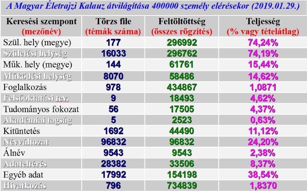 A 2016. január 31-én 356112 személy rekordját tartalmazó adattár közvetítő szerepet, információs igényfejlesztést vállal a hagyományos és elektronikus információhordozók felé a modern technológia eszköztárával. Ezzel egy olyan XXI. századi korszerű művelődési megatrendet kíván képviselni, amit elsősorban az jellemez, hogy az információs szuper-sztrádán integrálódás megy végbe a kulturális örökség és az elektronikus könyvtár fejlődés között.